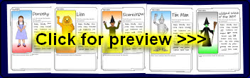 Printable writing frames for writing descriptions/profiles of characters from The Wizard of Oz story.