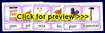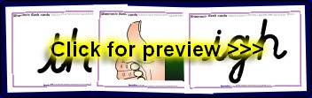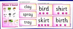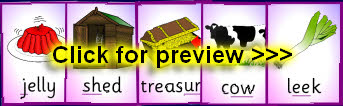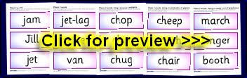 A set of picture and word cards for each phoneme to be taught in Phase 3. Phonemes are underlined.
