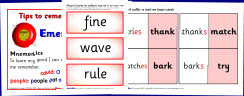 A set of A4-sized visual aids for use in the suggested ‘Flashcards’ activity on pages 82-83 DfES ‘Letters and Sounds’ publication. Includes 26 phonemes from Phase 3 and accompanying mnemonic images that can be printed on the reverse of each sound.