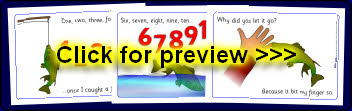 A set of A4 visual aids to accompany the well-known rhyme ‘1, 2, 3, 4, 5, once I caught a fish alive’.