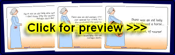 A set of A4 visual aids to accompany the well-known rhyme ‘There was an old woman who swallowed a fly.’