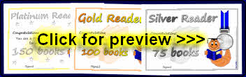 A set of 5 certificates to award children on reading different amounts of books throughout the school year. Includes Platinum reader (150 books), Gold reader (100 books), Silver reader (75 books), Bronze reader (50 books).