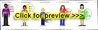 Print out these characters to make ‘sound family’ hanging mobiles in your classroom with the different graphemes for common phonemes.