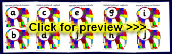 The lowercase alphabet letters presented on patchwork elephants.