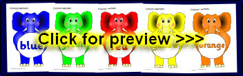 Colour words presented on different coloured cartoon elephants.