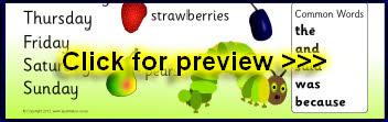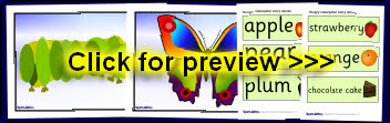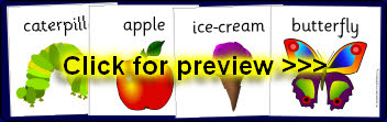 A useful set of visual aids for use with ‘The Very Hungry Caterpillar’ story by Eric Carle. Includes a set of 30 story words with pictures and large A4 story pictures.
