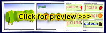A useful set of visual aids for use with ‘The Very Hungry Caterpillar’ story by Eric Carle. Includes a set of 30 story words in French with pictures and large A4 story pictures.