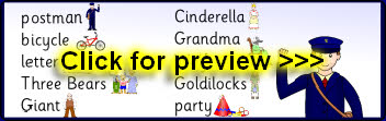 A printable word and picture mat featuring words from the story of ‘The Jolly Postman’ by Janet and Allan Ahlberg.