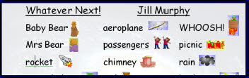 A set of A4-sized visual aids for use with Whatever Next! by Jill Murphy. Each shows various items and characters from the story together with important words. Great for use when orally retelling the story or for classroom displays.