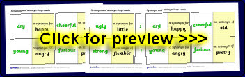 A set of 30 loop cards with various synonyms and antonyms Great for whole-class or smaller-group phonics game where one child calls out the start card and the pupils then match/call out the corresponding cards until the game ‘loops’ back to the original child. Ideal for teaching the difference between synonym and antonym.