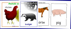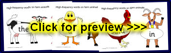 The top 100 high-frequency words presented on a selection of cartoon farm animals.