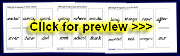 The next 200 common words as specified in the DfES ‘Letters and Sounds’ publication presented in cursive script on simple flash cards.