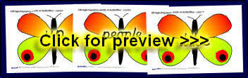 A colourful set of butterfly pictures featuring the 100 high-frequency words as specified in the DfES ‘Letters and Sounds’ publication, in cursive script. The images are A4 size by default, but can be resized in Adobe Reader to print 2, 4 or 6 per sheet.