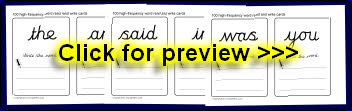100 high-frequency words in cursive script on flash cards with lines for children to practise writing the words underneath.