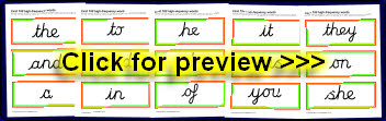 The 100 high-frequency words as specified in the DfES ‘Letters and Sounds’ publication, in cursive handwriting, presented on simple flash cards.