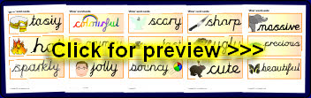A set of printable cards (3-per-page) featuring some useful and interesting adjectives with accompanying pictures. In cursive script.
