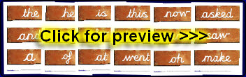 A large set of printable ‘bricks’ (3-to-a-page) featuring the next 200 common words listed in the DfES ‘Letters and Sounds’ publication, in cursive script. Designed to accompany our 100 high-frequency words on bricks.