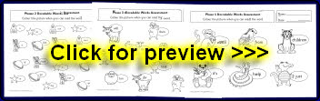 Printable assessment sheets for the decodable and tricky words in each phase from 2 to 5. Children colour the pictures next to the words they can read.