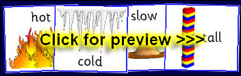 A set of 18 A4-sized posters showing opposite words and accompanying pictures.