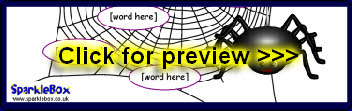 A simple teacher-controlled PowerPoint presentation where children are presented with a fun spider character and web together with words related to a writing topic.