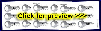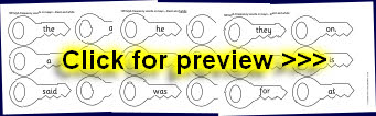 The 100 high-frequency words as specified in the DfES ‘Letters and Sounds’ publication presented on black and white key shapes. Could be used as record sheets where children colour the keys as they learn the words.