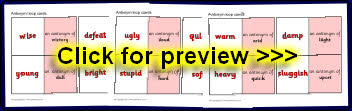 A set of follow-on cards featuring antonyms. One child calls out the start card and the pupils then match/call out the corresponding cards until the game ‘loops’ back to the original child.