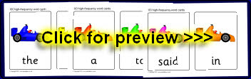 Flash cards featuring 100 high-frequency sight words and alongside coloured racing car images.