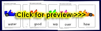 Flash cards featuring 200 common sight words and alongside coloured racing car images.