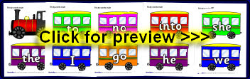 The 41 tricky words as specified in the DfES ‘Letters and Sounds’ publication, presented on coloured train carriages, with steam engine.