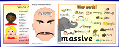 A set of posters showing the different types of words: nouns, pronouns, adjectives, verbs and adverbs with examples.