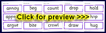 A large selection of imperative verbs presented on simple word cards with coloured borders.