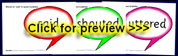 A set of coloured speech bubbles showing various alternative words for ‘said’. Great as visual prompts for children’s writing.