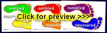 A set of colourful footprints showing various alternative words for ‘walked’. Great as visual prompts for children’s writing.