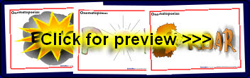 A set of 10 printable posters featuring onomatopoeia words with pictures and styles that represent the words.