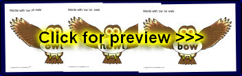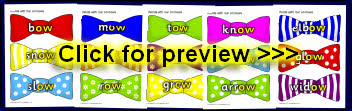 Words with the ‘ow’ phoneme presented on brightly-coloured patterned bows.