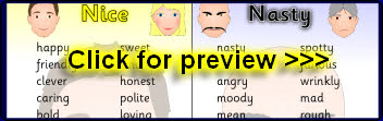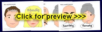 Printable nice and nasty faces featuring adjectives and adverbs to help children describe their characters and the way they talk.