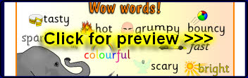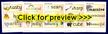 A printable word mat featuring lots of adjectives and accompanying pictures to help encourage children to use imaginative words when writing.