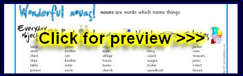 A simple word mat listing lots of useful nouns including everyday objects, people, places, food, clothes and vehicles.