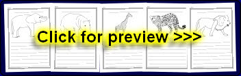 A set of simple printable sheets featuring images of African safari animals for children to colour along with writing lines for topic-related writing.