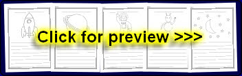 A set of simple printable sheets featuring space fantasy pictures for children to colour along with writing lines for topic-related writing.
