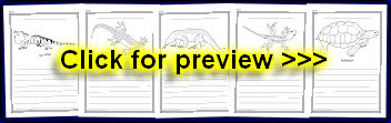 A set of simple printable sheets featuring images of reptiles for children to colour along with writing lines for topic-related writing.