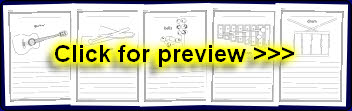 A set of simple printable sheets featuring pictures of various musical instruments for children to colour along with lines for related writing beneath.