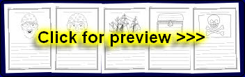 A set of simple printable sheets featuring images linked to pirates for children to colour along with writing lines for topic-related writing.