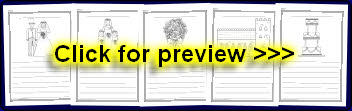 A set of simple printable sheets featuring pictures of things associated with traditional Christian weddings for children to colour along with writing lines for related writing beneath.