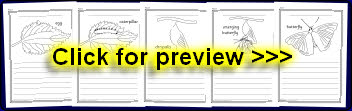 A set of simple printable sheets featuring images of butterfly growth for children to colour along with writing lines for topic-related writing.