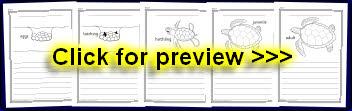 A set of simple printable sheets featuring images of sea turtle growth for children to colour along with writing lines for topic-related writing.
