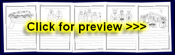A set of simple printable sheets featuring images from the Nativity story for children to colour along with writing lines for story-related writing.