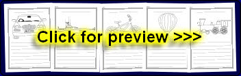 A set of simple printable sheets featuring images of transportation for children to colour along with writing lines for topic-related writing.