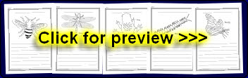 A set of simple printable sheets featuring images of minibeasts for children to colour along with writing lines for topic-related writing.