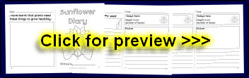 Printable sunflower diary booklets for pupils to fill out to record the growth of their sunflower plant. Includes spaces to write about how they planted their seed and record the height and number of leaves.